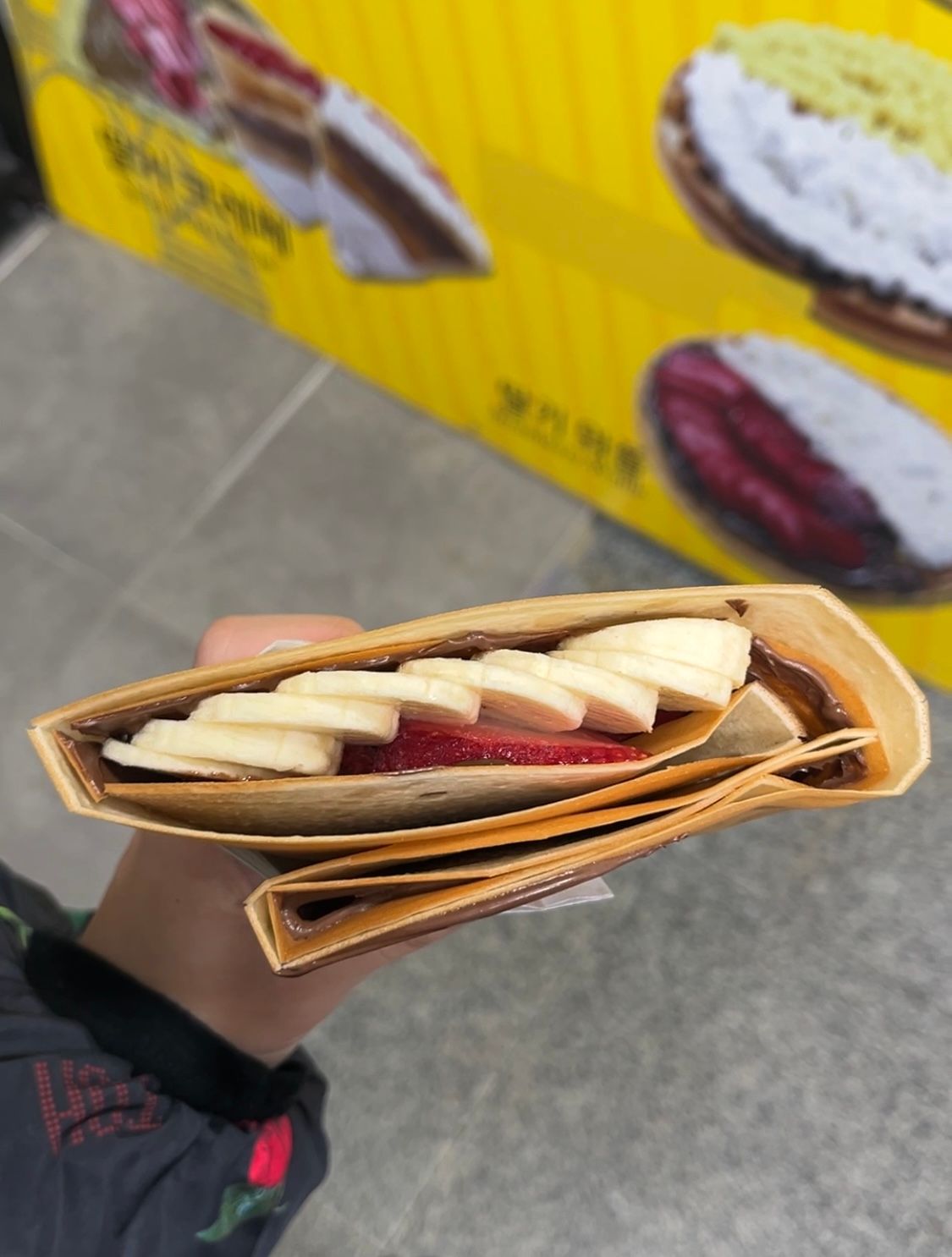 한 입 베어 물면 과일 맛이 먼저 느껴지고, 크레페 반죽은 겉은 바삭하면서도 속은 부들부들해서 식감이 정말 좋았어요. 단맛이 과하지 않아서 부담 없이 먹기에도 좋았습니다.