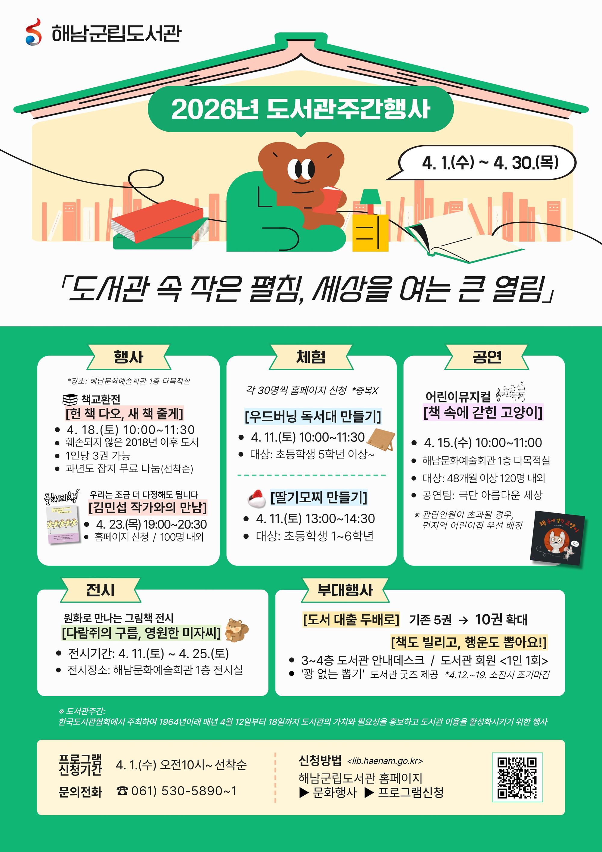 ๐ ์ฑ ๊ณผ ํจ๊ปํ๋ 4์, ํด๋จ๊ตฐ๋ฆฝ๋์๊ด์ด ๋ ํ์ฑํด์ง๋๋ค!