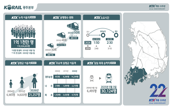 ๋ํ๋ฏผ๊ตญ ๋ํ ๊ณ ์์ฒ ๋ KTX๊ฐ ์ฌํด๋ก ๊ฐํต 22์ฃผ๋ ์ ๋ง์์ต๋๋ค.