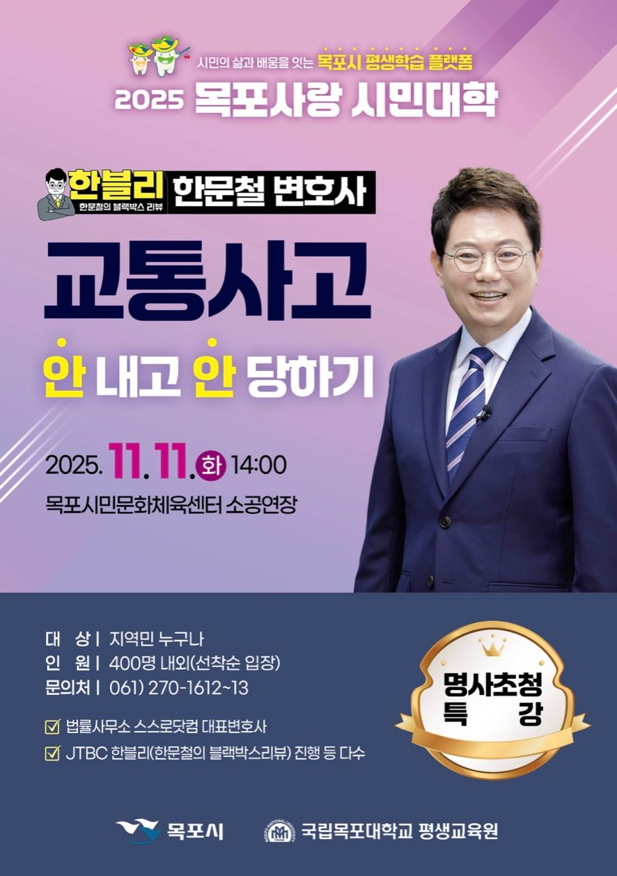 🗓️11월 11일(화) 오후 2시, 📍목포시민문화체육 센터 소공연장에서 교통사고 전문 변호사 한문철 변호사를 초청해 시민 특강을 진행합니다!